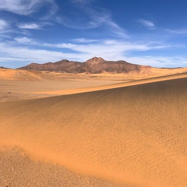 Drive southeast, skirting the cliffs of the Tassili, then crossing Imaharatène’s Tassili. We pass golden sandbanks and towering dunes leaning against cliffs, marking the entrance to the El Beridj wadi.