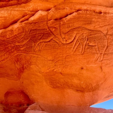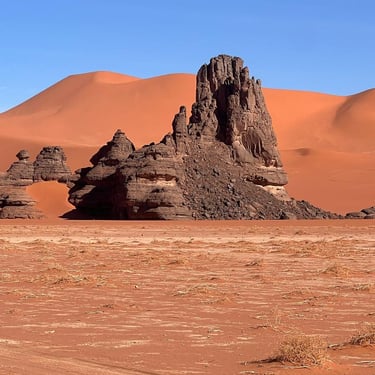 We follow the vast canyon of El Beridj, where wind-carved cliffs house many ancient rock paintings and engravings. After the magnificent orange dunes of MoulN’aga, a series of stunning Tassili landscapes lead us to the arches of Tamezguida. Through a maze of narrow canyons, we reach the vast amphitheater of Tin Merzouga, where endless dunes glow red at sunset.