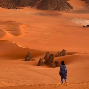 On foot, we explore the Giacometti-like sculptures of the Ouanaguen cirque, where multicolored sands frame finely carved sandstone forms. Through a tangle of grassy wadis and dunes, we reach our bivouac at Tin Tehak by vehicle.