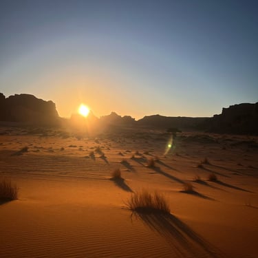 Arrival in Djanet at night, depending on flight schedules. Entry formalities for Tassili National Park. Transfer by vehicle to the Pleiades guesthouse for rest. After lunch, departure toward Amais, our first bivouac.